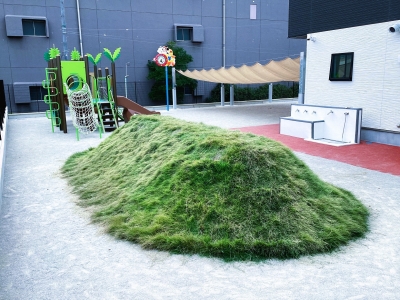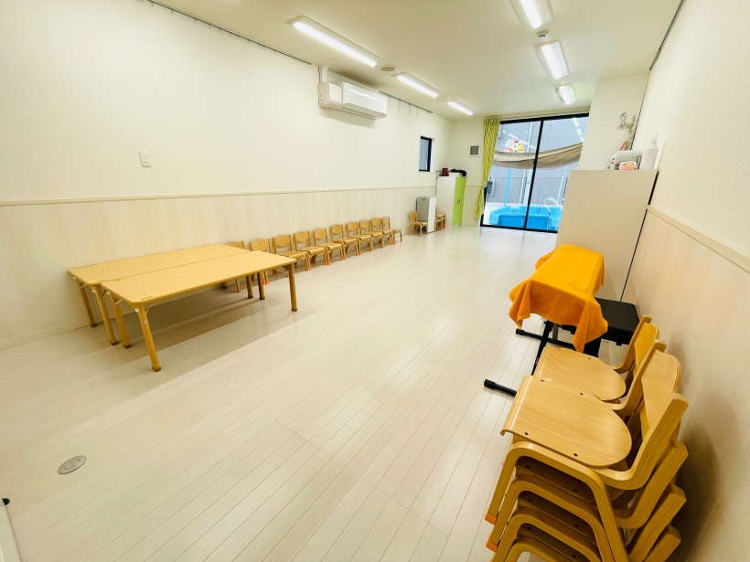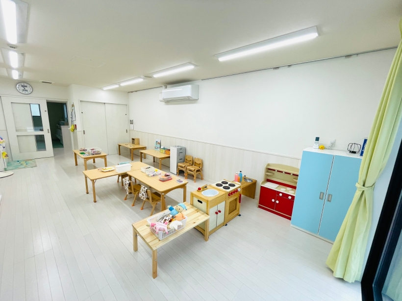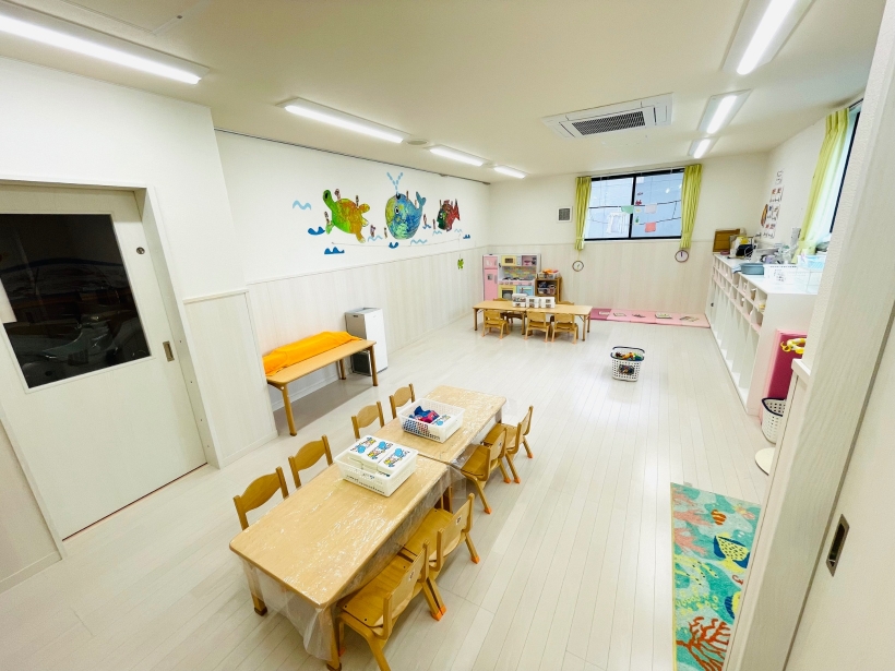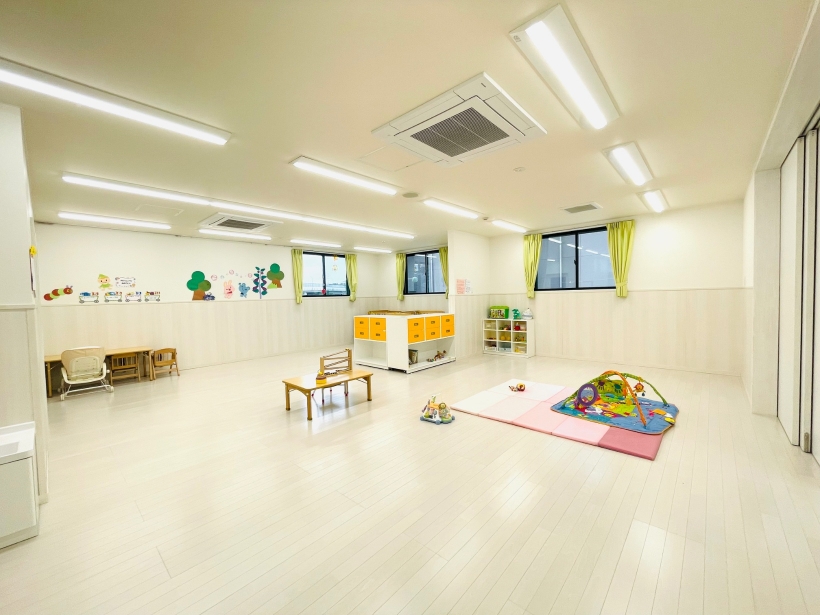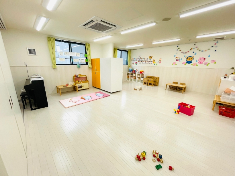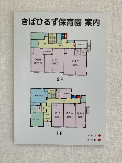 1階に幼児クラスの保育室、給食室があります。2階に乳児クラスの保育室、バルコニーがあります。