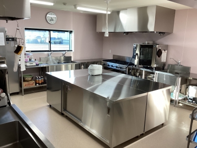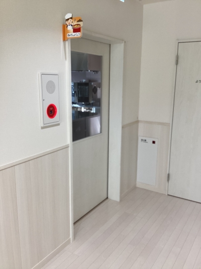 外からは子どもたちが「今日の給食は何かな~?」と覗いたり、中からは調理員が「いってらっしゃい~」と出かけていく子どもたちを見送ったりしています。