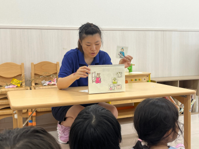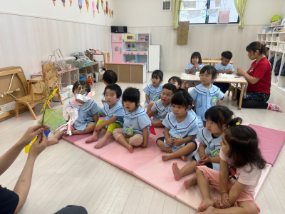 2025年 たなばたかい 7月4日に「たなばたかい」をしました。 みんな興味津々で笹飾りやパネルシアターを見ていました。 「たなばたさま」のうたは元気よく歌っていました。 みんなの願いが叶いますように。