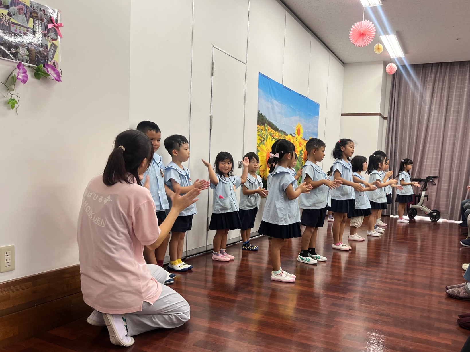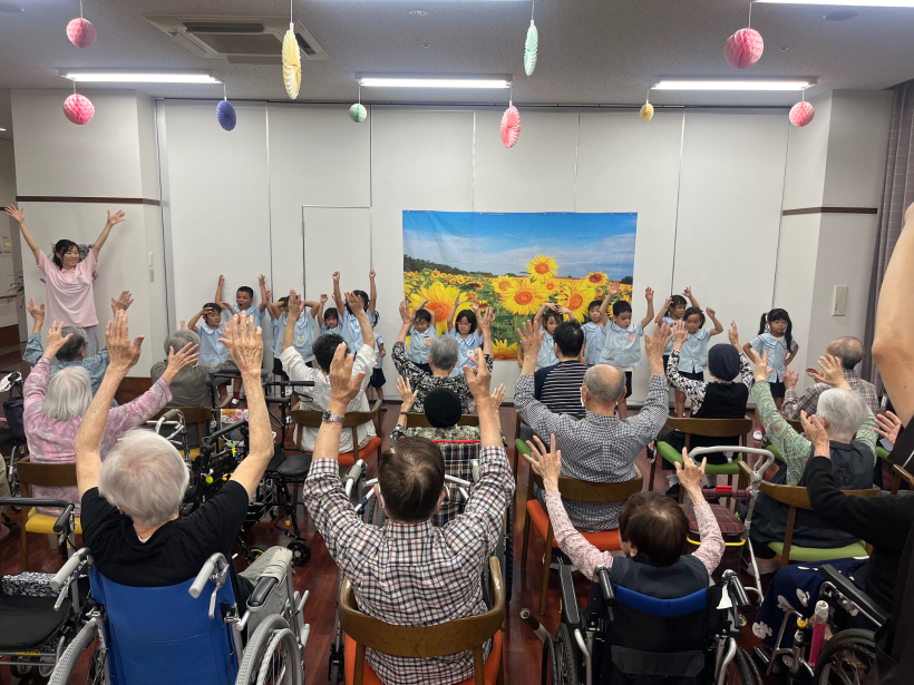 2025年 敬老会 「清里園」との交流 今年の敬老会は、ぞう組、きりん組の子どもたちが老人ホーム「清里苑」で交流を行いました。 この日のために「高校三年生」という曲で歌と体操を練習していた子どもたち。 披露すると、おじいちゃん、おばあちゃんも一緒に歌や体操で盛り上げてくれ、子どもたちもとても嬉しそうにしていました。 その後は、流れ星の数を当てるゲームや爆弾ゲームを一緒に楽しみ、最後には、水族館で見た生き物たちを絵に描いてプレゼントしました。 普段できない体験ができ、楽しい時間を過ごせた様子の子どもたちでした。