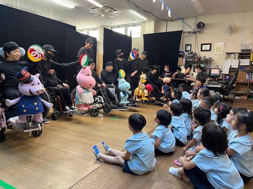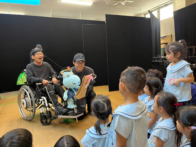 2025年 人形劇団紙風船 ぞう組、きりん組の子どもたちで、人形劇団紙風船さんの人形劇を観劇しました。 人形劇団紙風船さんは、NPO法人愛実の会が運営する人形劇団で、車椅子に人形をつけて動かして人形劇を行います。 みんな初めて見る紙風船さんの人形劇に釘付けでした。 劇の途中では、子どもたちに向けて様々な質問もあり、みんな張り切って答えていましたよ。 最後には、お話に登場したカバのぼーちゃんからプレゼントをもらい、大喜びの子どもたちでした。