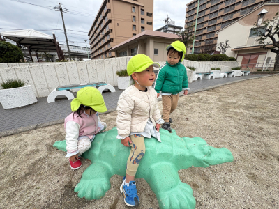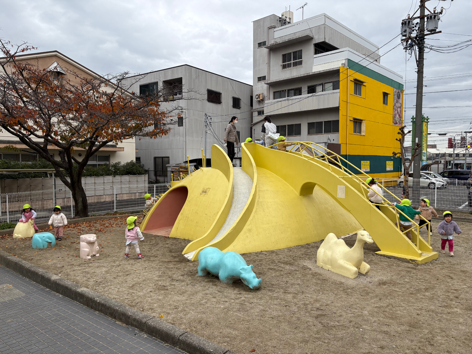 公園に着くと、おやつを食べ、滑り台やトンネルくぐりをしたり、落ち葉を集めて遊んだりしました。
