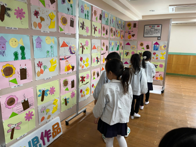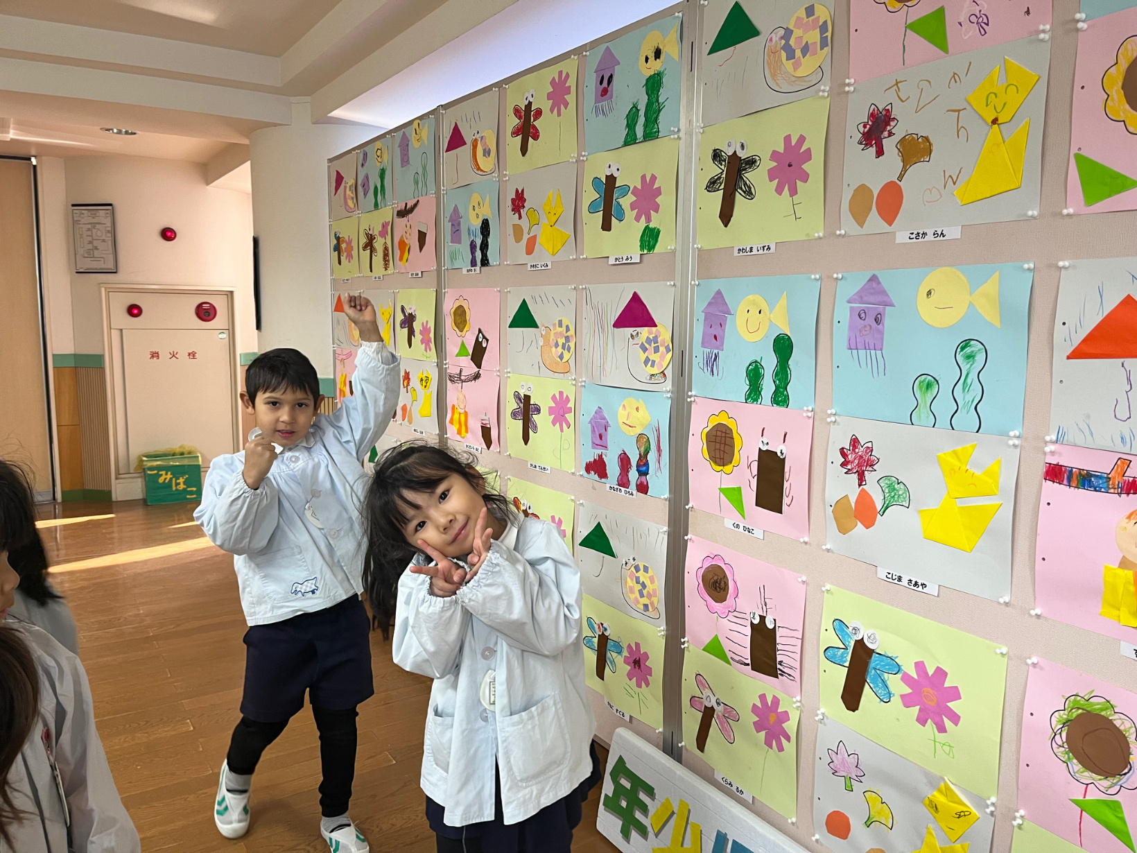 最初は保育園の大きさに圧倒されていたぞう組さんでしたが、たくさんの絵や製作物が飾ってあるホールに入ると、目を輝かせ色々な作品を見始めました。