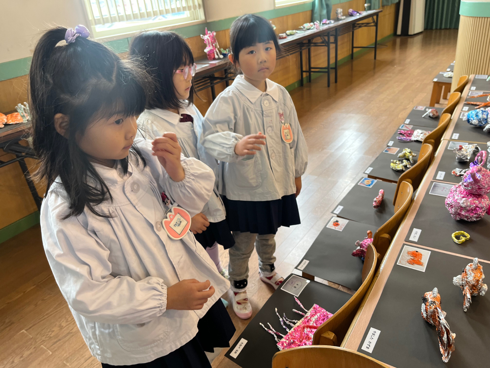 「目がボタンになってる!」「ビーズが付いててかわいい!」「これはキリンに見える!」と嬉しそうに作品を見ていました。