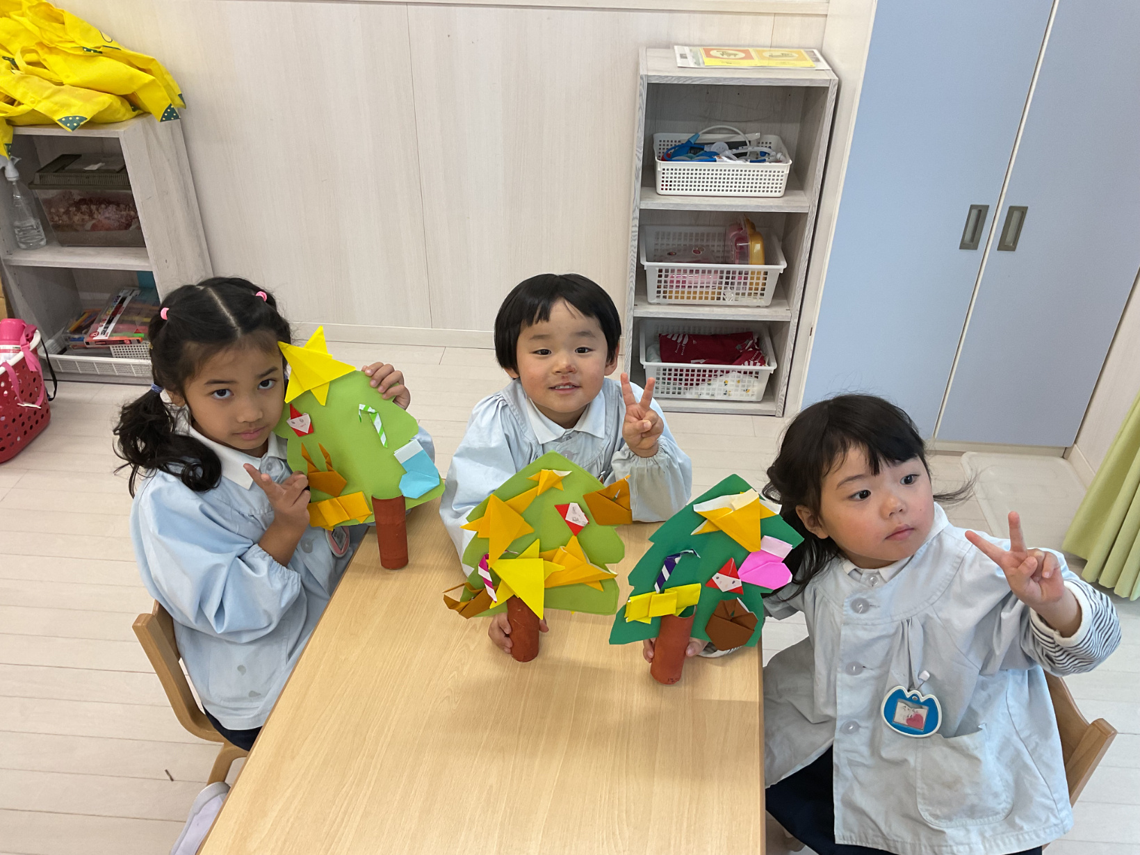 見つけた折り紙を自分で作ったツリーに貼って自分だけのツリーを完成させていました。