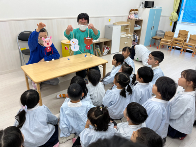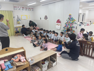 うさぎ、くま、雪だるま、トナカイ、サンタさんの人形が登場するお話で、内容が面白かったのでみんな前へ前へ集まっていました。