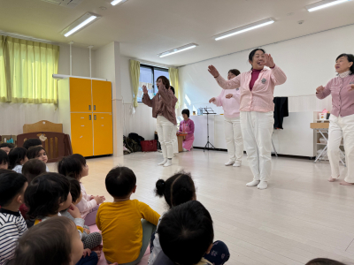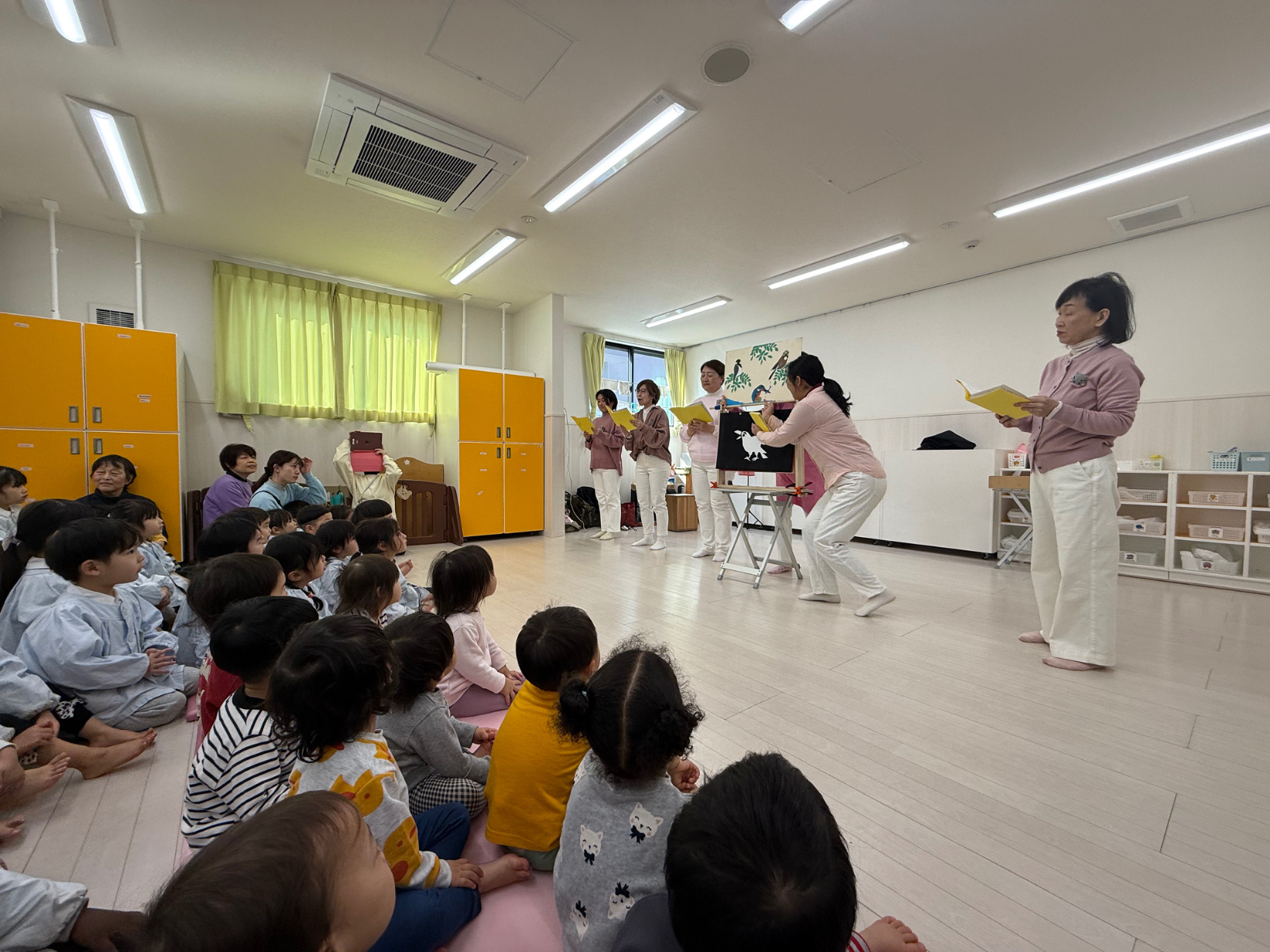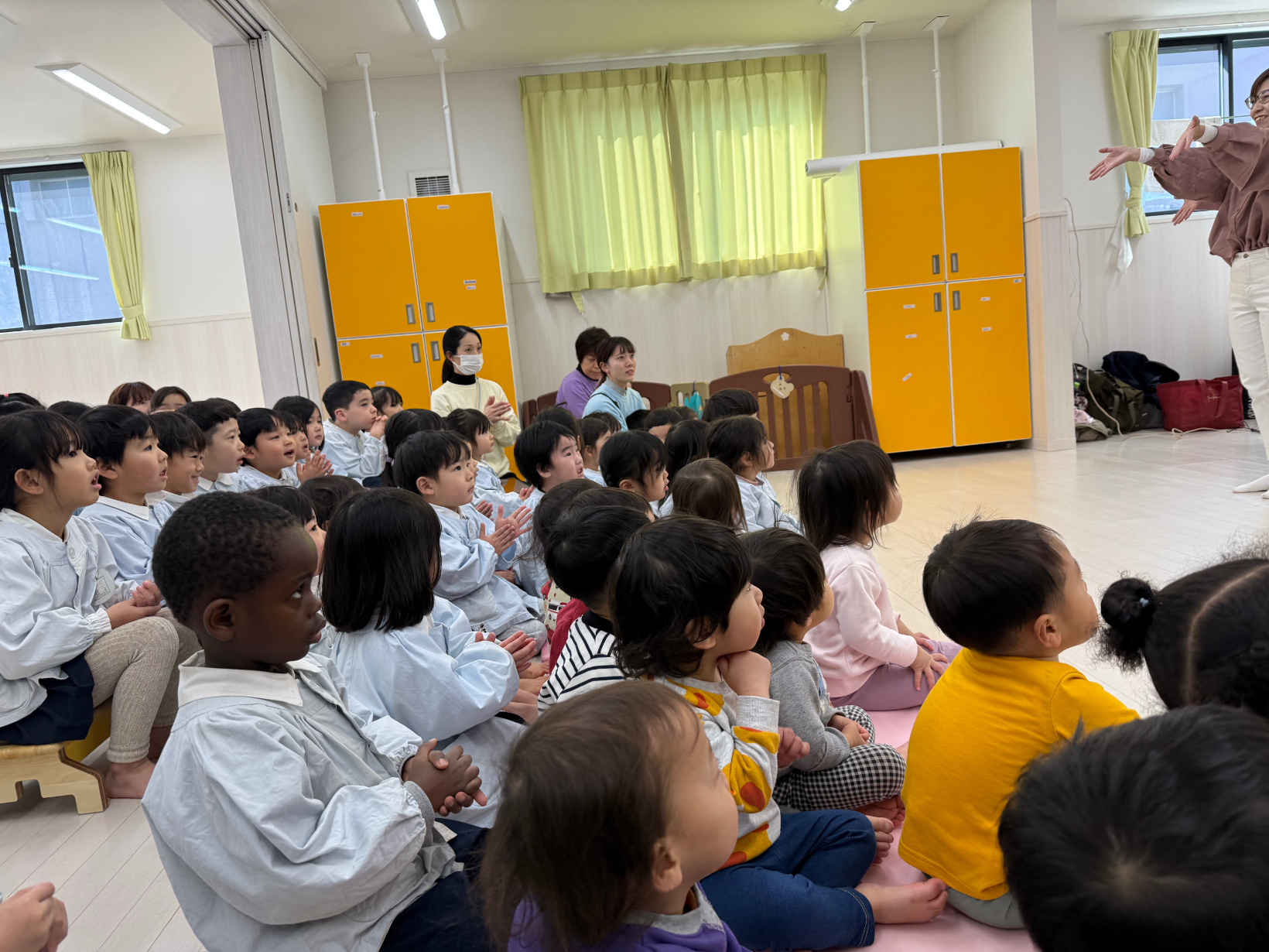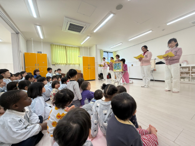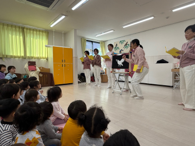 2026年 おはなしかばさん 「おはなしかばさん」という歌や言葉あそび、紙芝居を観せてくれるグループの方が来てくれました。 最初は歌やダンスが始まり、手拍子をしながら見ていました。 『ふくろうの染物屋さん』の紙芝居は、カラフルなペンキが何度も出てくるお話です。 言葉あそびでは、谷川俊太郎の言葉のリズムを大切にした内容でした。 『ブレーメンの音楽隊』の紙芝居は、年長児が劇あそびをしていたので「これ知ってる」と嬉しそうに話し、真剣に観ていました。