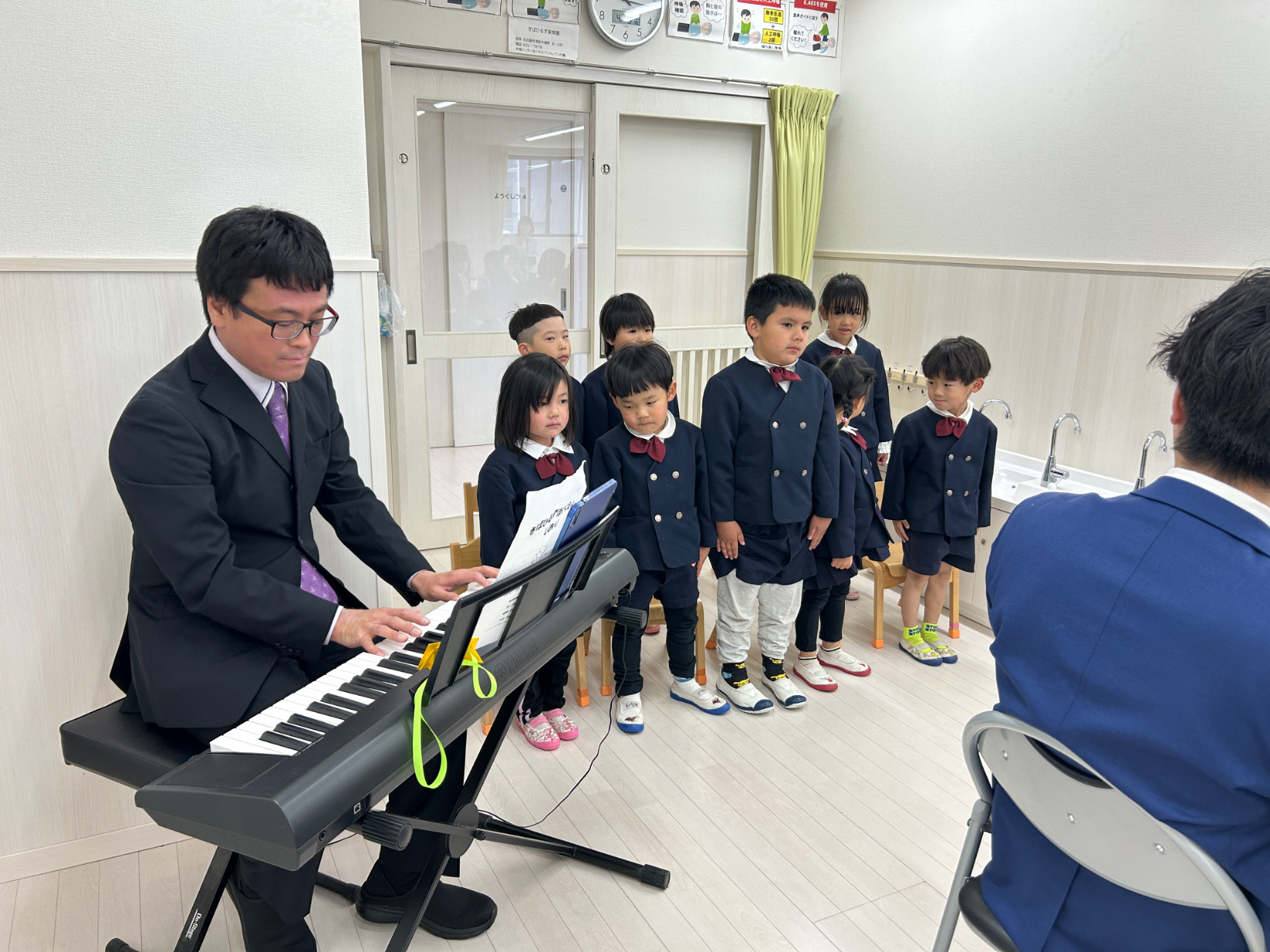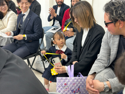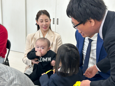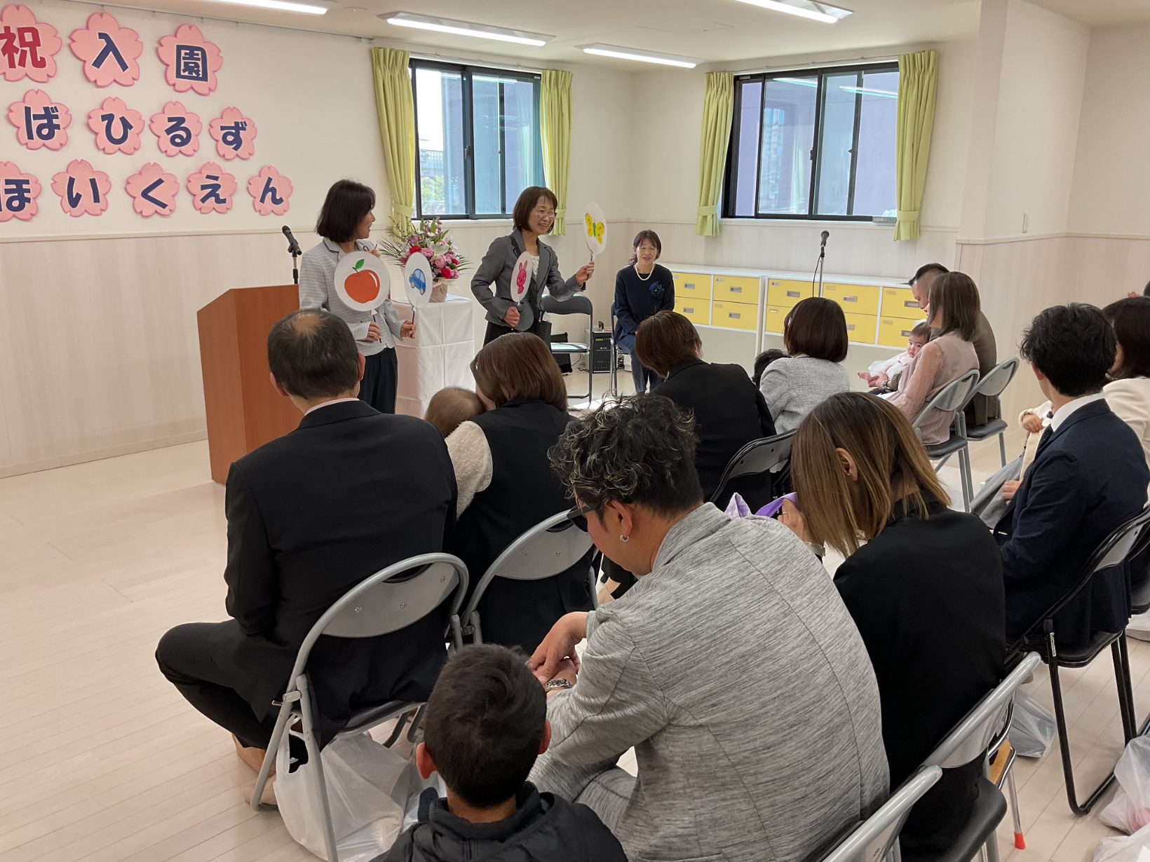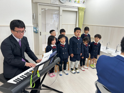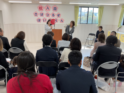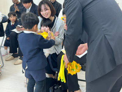 2026年 入園式 令和8年度の入園式を行いました。 最初は保育者のペープサート「ふわふわ風船」を観ました。 小さい子も、興味津々で楽しんでいました。 園長先生の挨拶が終わり、新入園児の名前を呼びと、お母さんと一緒に返事をしていました。 返事をすると年長児からペンダントをもらえて、ニッコリしていました。 最後に、年長児が「せんせいとおともだち」の歌を披露しました。 とても上手に歌っていました。