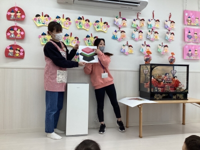 雛飾りを使ってひなまつりの人形の種類や菱餅の意味の説明をしました。