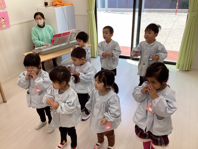 練習では大きな声で歌っていた子も、みんなの前になると緊張して練習通り歌えるかな?と不安な子もいましたが、大きな声で上手に歌うことができました。