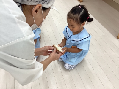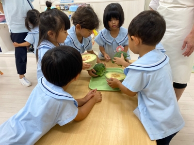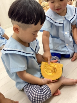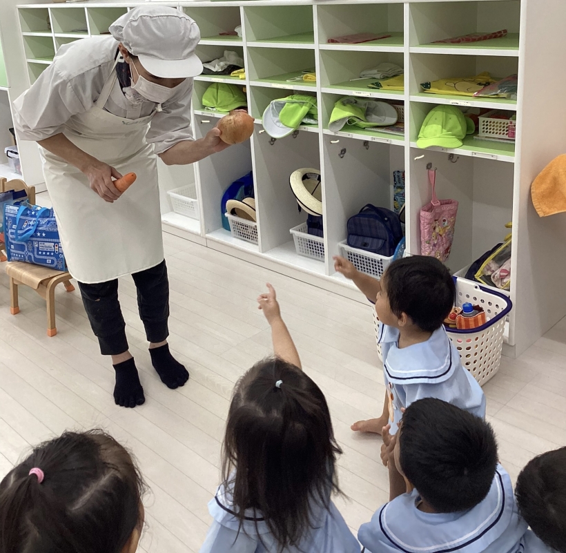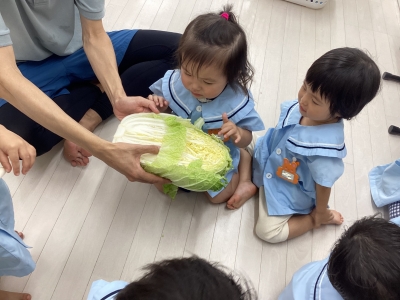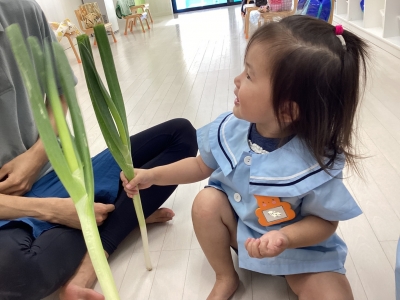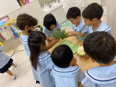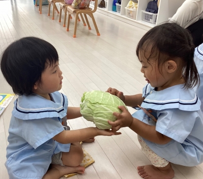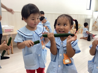 7月末からうさぎ組、ぱんだ・きりん組のクラスでは、食育の一環で給食室の先生に入ってもらって調理前の野菜を触りました。