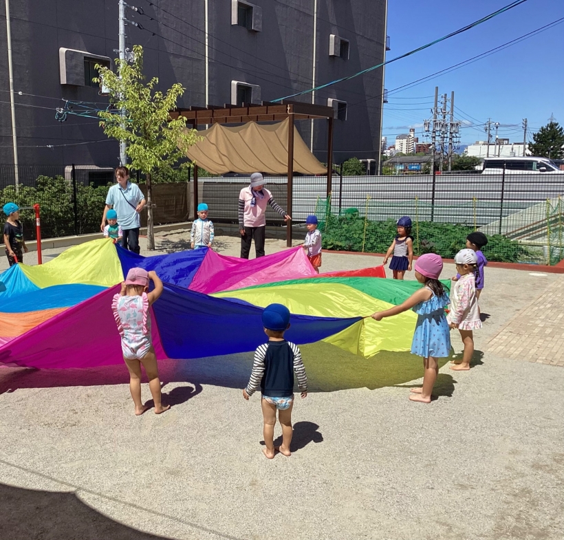 9月の運動会に向けて水遊びの時間の前にバルーンの練習をしています。