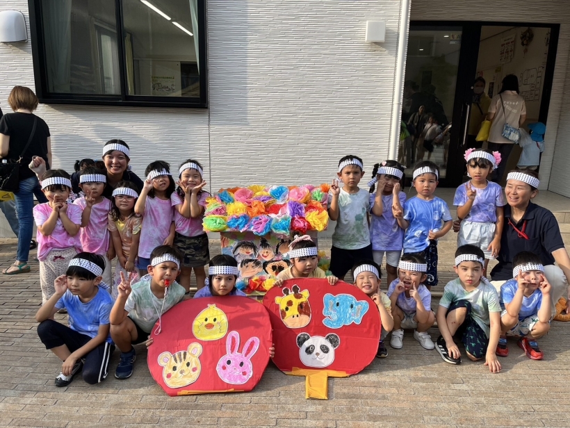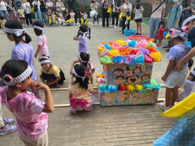 担ぐ時の掛け声も自分達で決め、みんなで大きなおみこしを担ぎました。「重い!」「歩けない!」と最初は少し苦戦していた子どもたちでしたが、何度も練習し、本番ではとってもかっこよくやり遂げました。