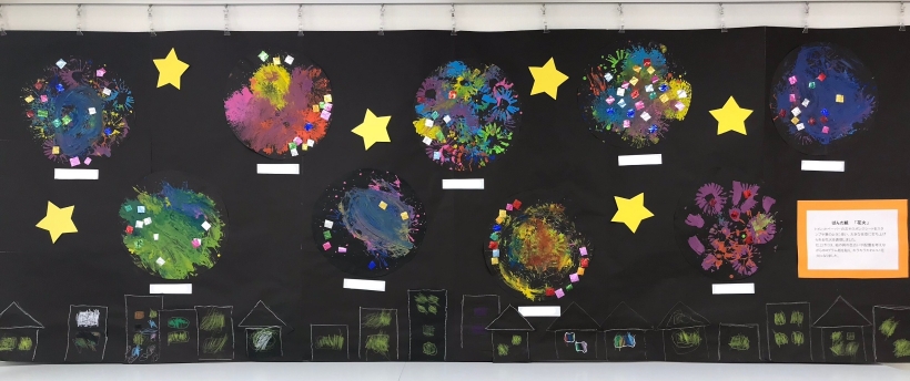 3歳児は「花火」2歳児は「海の生き物」1歳児は「ひまわり」0歳児は「すいかとおばけ」を作りました。