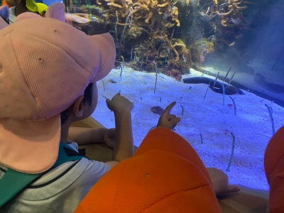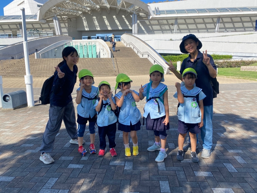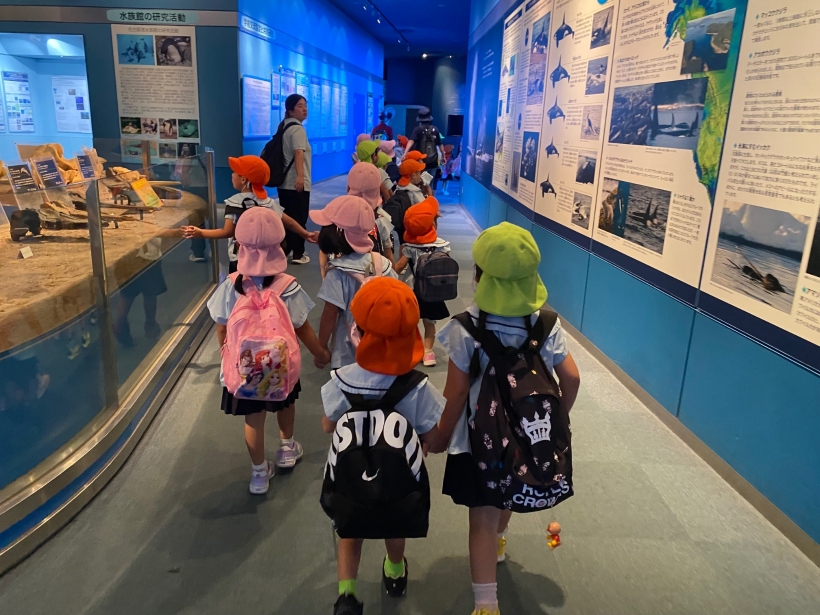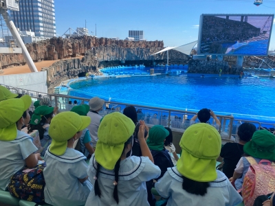 水族館へ行きました 幼児クラスで、名古屋港水族館へいきました。 水族館へ行くのをずっと楽しみにしていた子どもたち。 「まだかな」「はやくはやく」と前日もそわそわしていました。 水族館では、イルカショーやペンギンのえさやり、大きな水槽をみんなで見ました。 イルカショーでは、「わぁ!!」「すごーい!」と大はしゃぎで拍手をしていました。 みんなでおにぎりも食べ、とっても楽しい1日になりました。